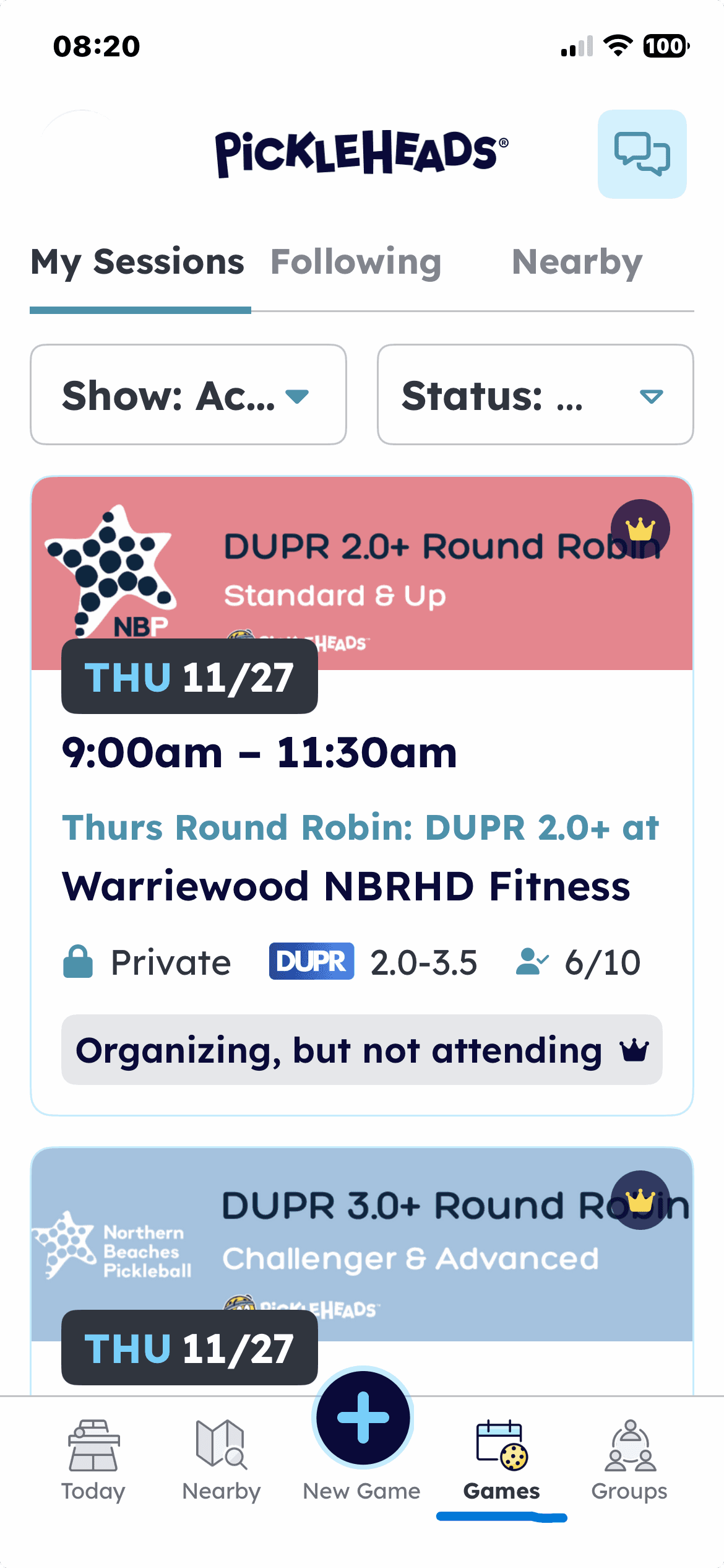 In the Pickleheads app, click on the Games icon to find DUPR sessions to play in.